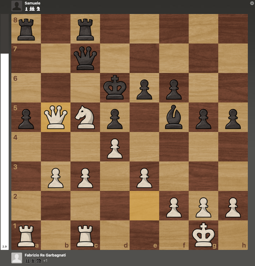 C'è questo momento, voglio dire il momento, dove tutto si decide. Il Nero ha il Re su d6, esposto, vulnerabile. Io ho la Donna attiva, il Cavallo su c5, e ho appena preso un pedone con 24. Dxb5. La posizione chiede di essere chiusa. Con precisione. Con tecnica. Con quella brillantezza che trasforma una buona partita in una partita memorabile.